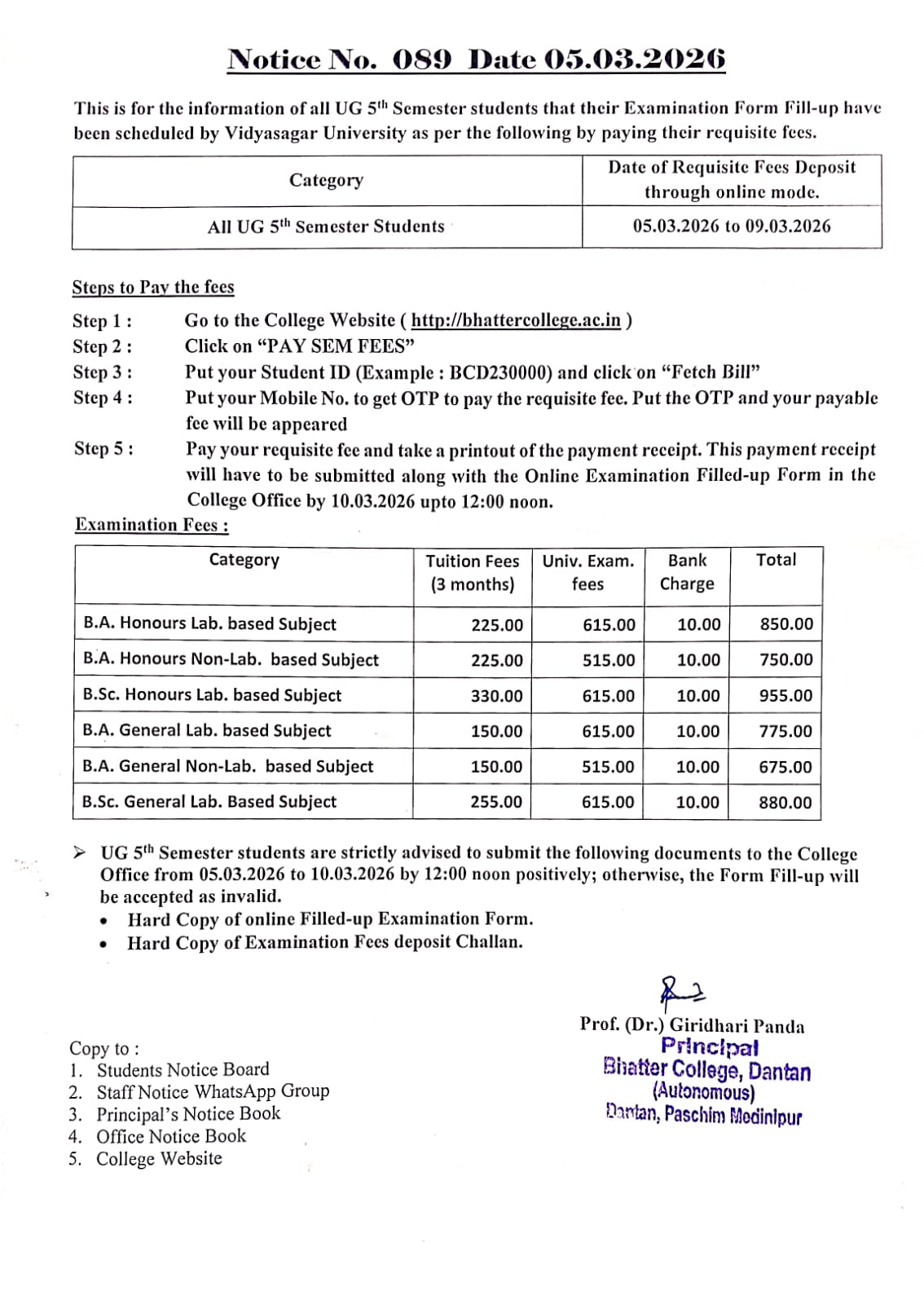 Examination Form Fill-up of UG 5th Semester (regular) students