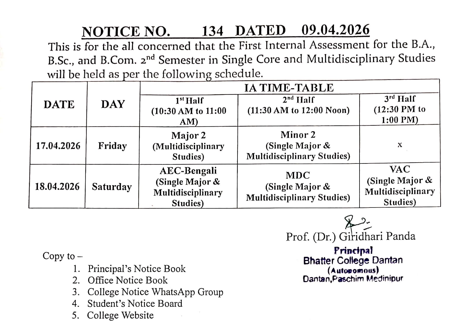 Schedule of 1st Internal Assessment of BA/BSc/BCom 2nd Semester 2026